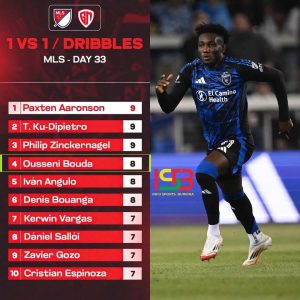 Le Burkinabè Ousseni Bouda brille toujours en Major League Soccer. À l’issue de la 33e journée, l’attaquant des San Jose Earthquakes s’est imposé parmi les cinq meilleurs dribbleurs du championnat américain, confirmant son excellente forme et son influence sur le terrain.